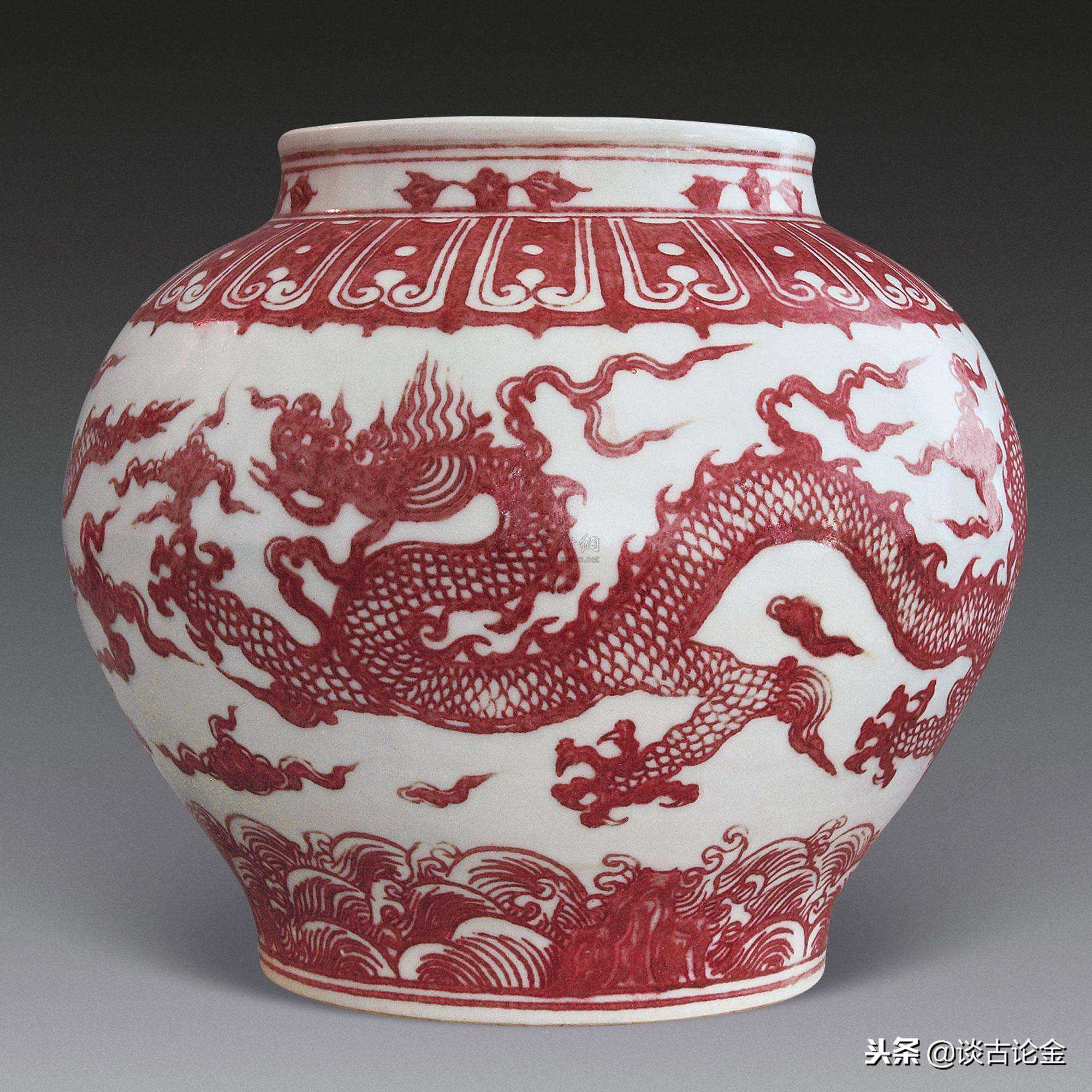 釉里红起源于元代,在洪武年间曾经大量烧制,其呈现出来的色调灰暗并且有晕散,不但用于器物,甚至被用于建筑(这主要是根据江苏省南京市明故宫遗址考古发现的洪武年间宫殿建筑用瓷),这在以后几乎从来没有出现过。永乐朝的釉里红几乎完全没有传世文物,也是通过江西省景德镇市御窑厂遗址的考古发现才确定永乐朝釉里红确实存在。在宣德朝,釉里红烧制极为成功,产生出鲜艳的红宝石一般的色泽;而在成化朝,釉里红也出现了罕见的珍品——对照谈古论金在下面和大家提到的红釉的发展史,我们就很清楚这两种名称似乎有关联的所谓红釉其实完全是两回事。