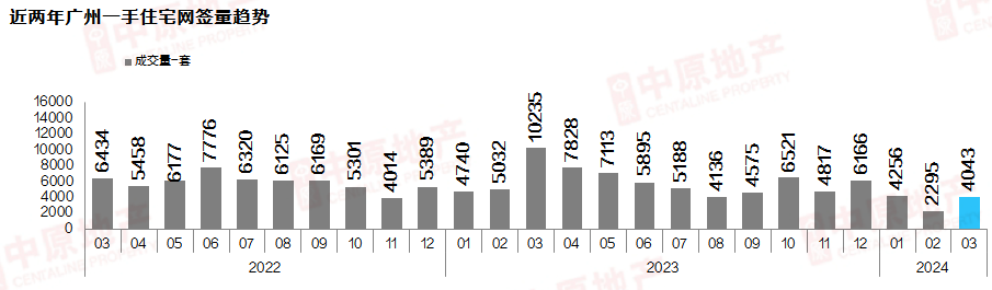 近日,广州中原研究发展部发布数据,广州3月新房共网签4043套,环比2月春节月虽回升76%,但与去年同期破万套水平相比,仍大幅下跌6成。