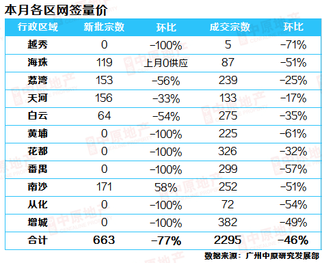番禺和白云网签量排在全市第三、第四,但从番禺跌幅近6成的情况来看,受建面约120㎡以上住宅放开限购影响,番禺的吸引力已被大大削弱。