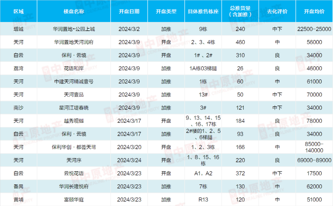 据广州中原研究发展部数据,3月广州共有18盘推新,合计3592套,为2023年9月以来推货量新高。