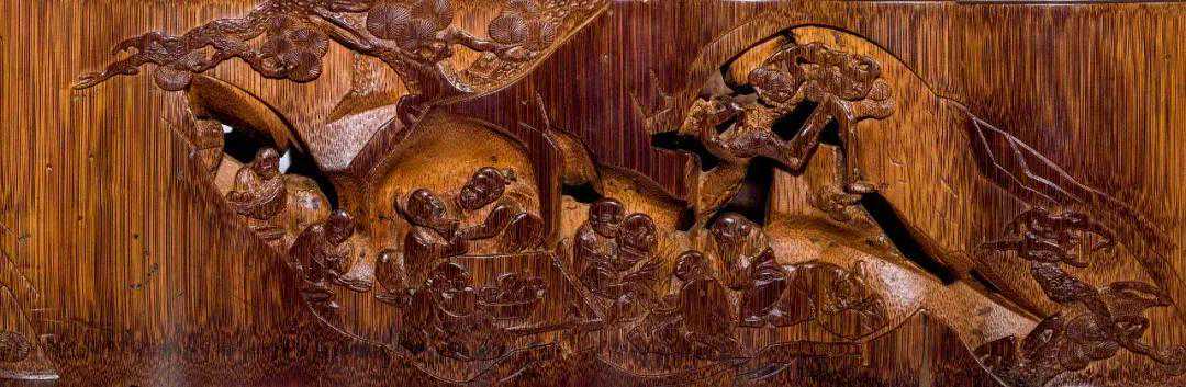本品取竹为材,直筒形制,下承矮足,做工考究。器身以高浮雕、深雕刀法饰文会图,山石崚,树木蓊郁,筒身共雕饰十一个人物,环以松树,写意如画。高士或畅谈,或题诗,或赏画,姿态各异,形象生动。整体纹饰雕刻精细入微,布局满密考究,刀工细腻劲道,或大开大阖,或精雕细琢,所用刀法娴熟老练,镂刻处或深挖直削,或层层相继,立体感十足,神游其间如徜徉书画之中,艺术水平高超。笔筒包浆苍润雅洁,品相上佳,颇为难得,是不可多得之案头佳供,颇可襄助文思。拍品装饰风格、布局、雕饰技法及竹材质地、皮色均与纽约大都会博物馆藏清康熙竹雕文会图笔筒相类,为同时期嘉定派竹雕文房佳作精品,可资比较。