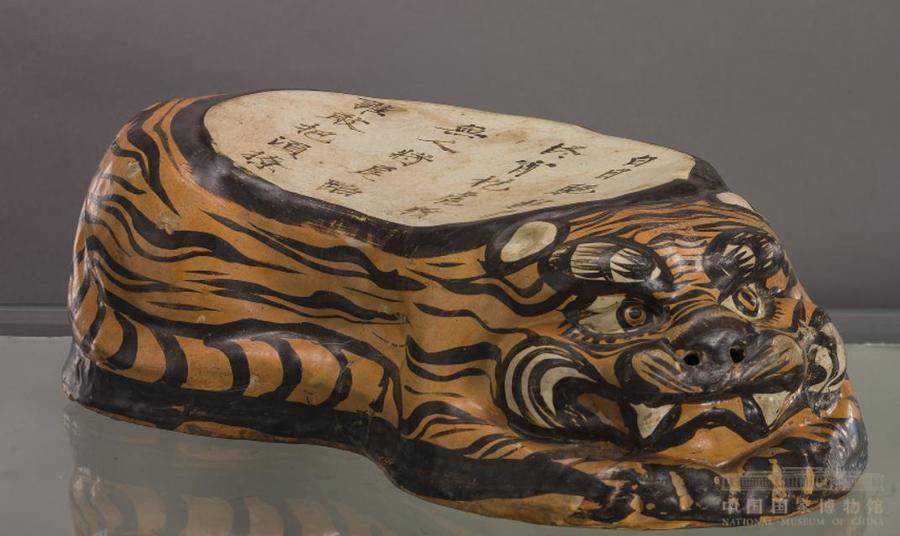 这件藏于故宫博物院的褐釉彩绘虎形枕,虎身为枕身,在黄釉下以黑彩描绘模仿虎皮斑纹。传世的此类虎形枕主要为河北磁州窑、河南禹县扒村窑、山西长治窑生产,风格较为接近。