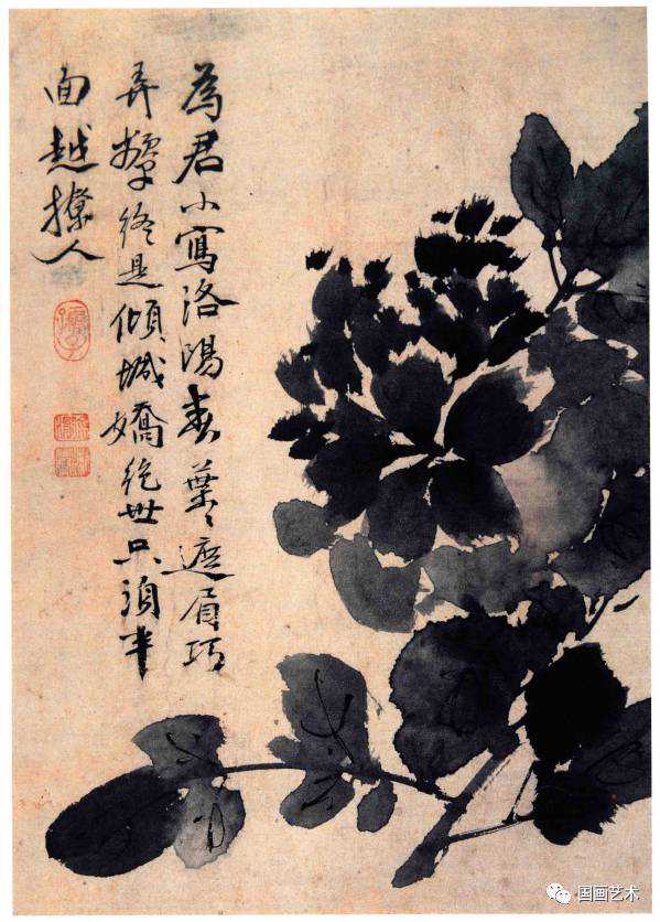 就牡丹的写意画法而言,在南宋就已出现了牧溪的大写意,开启牡丹写意法的先河,明代沈周的墨牡丹即出自牧溪,但较文秀。吴门画派的陈淳画牡丹师法沈周较多,用笔放纵又似牧溪,但笔势上较清秀。牡丹画真正的写意画法,徐渭应是最为杰出的代表,他的写意牡丹狂放而不失法度,水墨淋漓,信笔挥洒,纵横不可一世,不仅使牡丹的写意画法走上成熟,更使其笔下的牡丹成为高逸的人格象征。