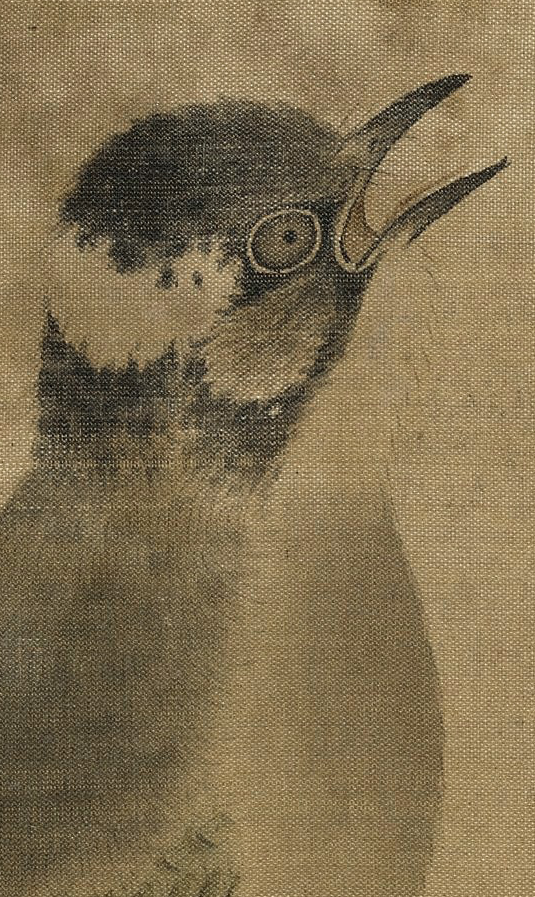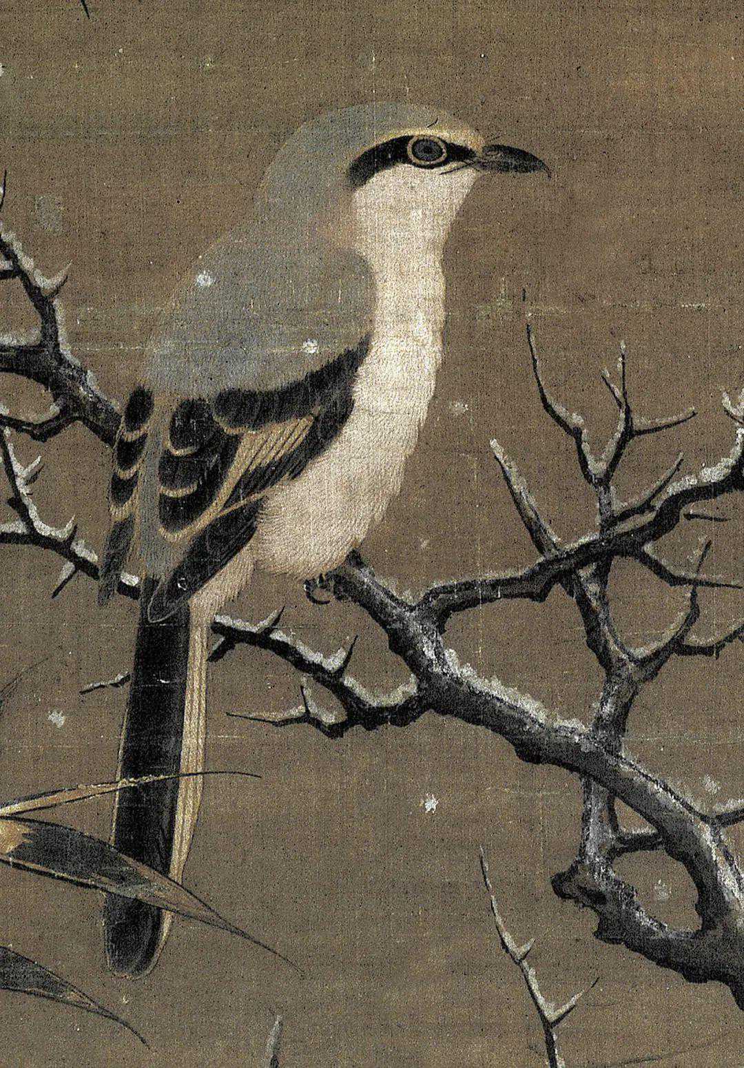 此图并未叙事,灰伯劳就这么安安静静地卧在荆棘枝上做一只美鸟,描绘精妙写实而不呆板,生气十足。枝柯坚实有力,用笔提按有致。弹雪的火候也把控得恰好,气氛轻盈而不做作。