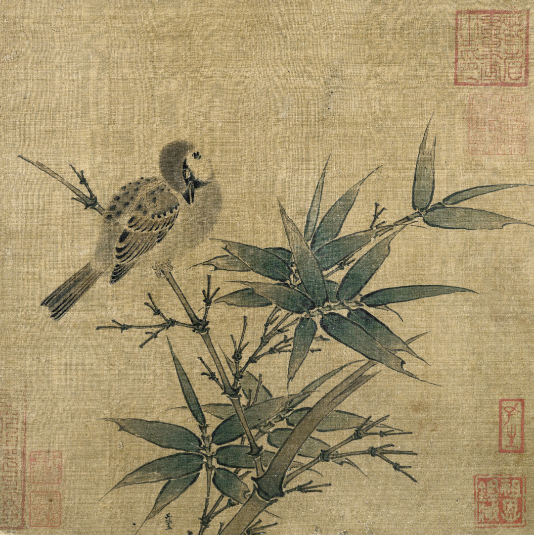 元代老赵本是南宋皇族移民,入仕元廷。能书善画,同样的竹禽题材,老赵似乎更有想法脱出套路。要禽是吧,画一只臭烘烘的戴胜鸟,画竹子是吧,只画竹枝不画竹叶不算犯规吧。画面敷色明净,笔法谨细。工致的画风秉承了北宋画院的画法,但“幽篁”的画法采用了书法用笔,显示了画家对文人情趣的追求。在赵孟頫的流传作品中花鸟画最为少见,此幅应为其早年之作。
