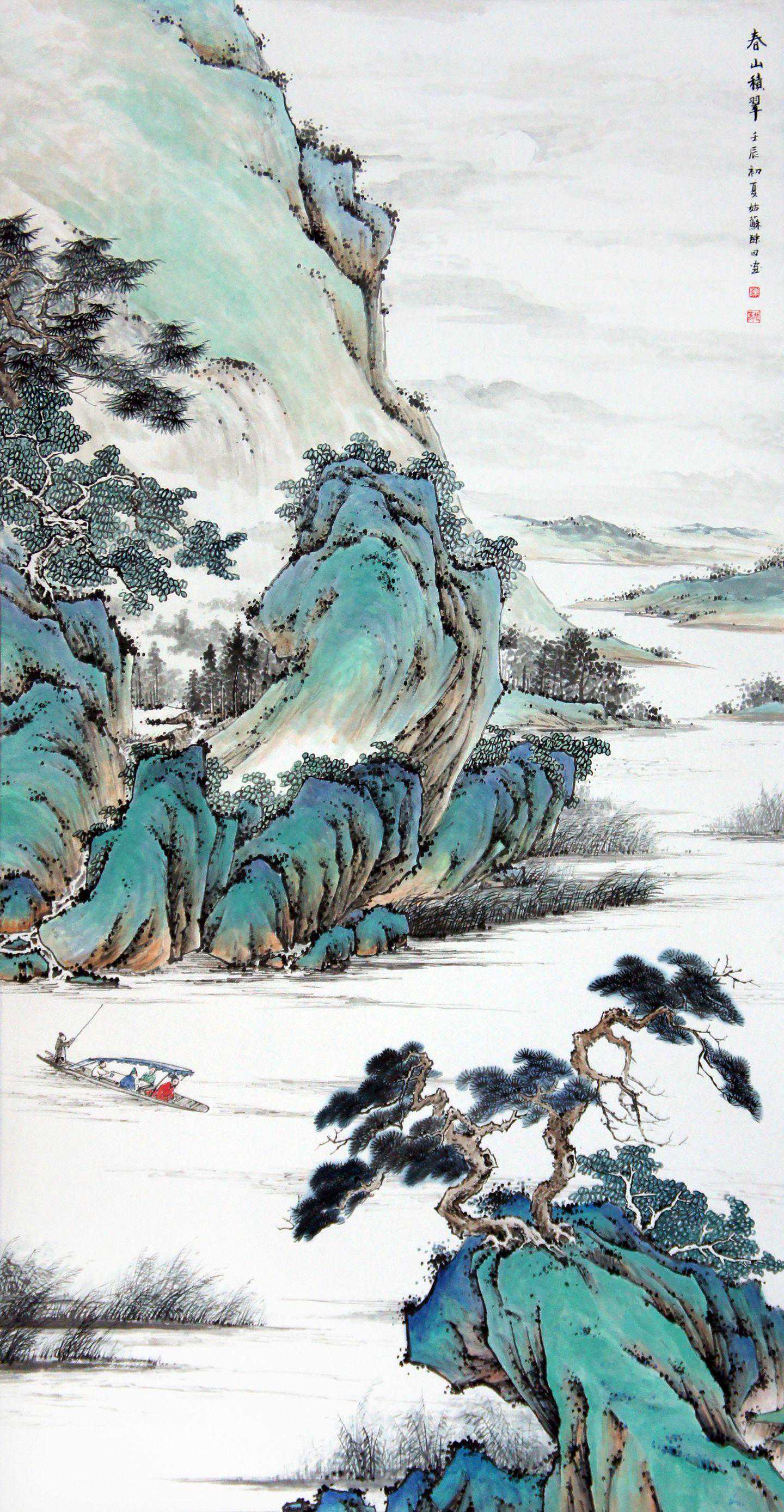 陈社春的山水,布局精致、繁简分明,有大开大合之气。讲究布白,强调虚实相生,阴阳相克,主宾相合,错落有致,大气中见精辟,简约中见深远,无论高山大川,还是平远小景,都有雄伟壮阔之气势,并在平淡、无华中寓高雅与蓬勃,在险峻奇异中寄静谧与别致。既有北派雄浑奇伟之势,又有江南圆润挺拔之秀。