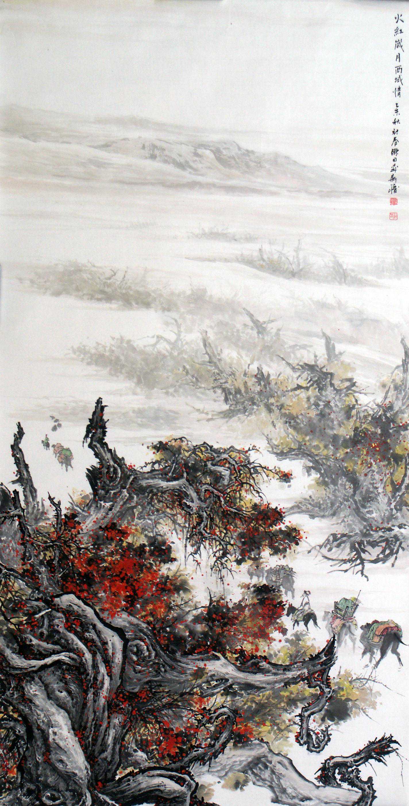 通过长期努力,巍巍天山、辽阔草原、大漠胡杨、驼铃牧歌、民族歌舞、牛马羊群在他的作品中得到了升华,表现得是那么的朴实而生动,巍峨而旷达,形成了一幅幅畅快大气的画面。让人无法想象这些作品竟出自一个从小生活在江南水乡的画家之手。