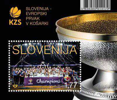 2017年12月12日,斯洛文尼亚邮政为男篮在欧洲锦标赛中夺冠发行一枚小型张纪念邮票。本届欧锦赛开赛以来,斯洛文尼亚男篮在小组赛中连克强敌,取得五连胜闯入半决赛,又以92:72爆冷力克传统劲旅西班牙队,利剑直指9月17日同塞尔维亚队的决战。斯洛文尼亚男篮一路过关斩将,有如一匹骁勇的“黑马”,其骄人战绩早就让斯洛文尼亚210万国民热血沸腾了。决战前,斯洛文尼亚总理采拉尔按捺不住激情,率6000名斯洛文尼亚人赶往土耳其伊斯坦布尔决赛赛场助阵。当日,袖珍的卢布尔雅那约热•普奇尼克国际机场发送了历史上单日最多飞往伊斯坦布尔的航班和临时包机,11架飞机满载全员,带着必胜的豪情壮志直冲云霄。很多没有买到机票的斯洛文尼亚人则自驾汽车或转乘长途汽车,历经17小时车程前往伊斯坦布尔呐喊助威。临近17日午夜,斯洛文尼亚男篮以93:85战胜强敌,首次夺得欧洲杯冠军。捷报传来,一向安静的卢布尔雅那城内无数烟花爆竹在雨夜中升空炸响,市中心主要街道上行驶中的车辆集体鸣笛欢庆,更有人在滂沱大雨中脱掉衣衫,舞动大幅国旗。