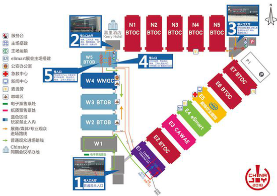 这是各场馆的总地图。各游戏厂商的场馆集中地图上方北侧区域,即图中深红色标记BTOC的区域。