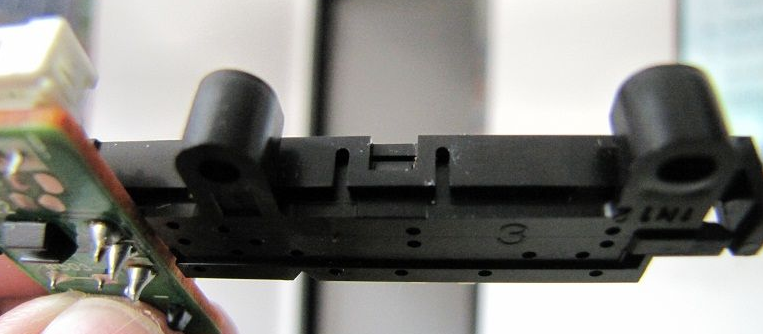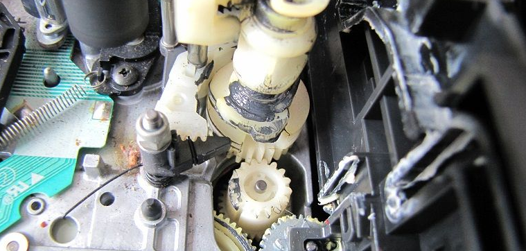 再卸掉带仓总成的4个红色金属螺纹螺丝,取下带仓总成,掰住三个卡扣,即可卸下带仓传感开关,把其电路板上的三个焊点焊开,取下带仓传感开关,轻轻撬开其周围三个卡扣,撬开带仓传感开关可见其内部铜黑氧化比较严重(分别按拆卸顺序放于一旁,螺丝分类按拆卸顺序放好)。