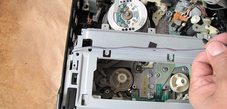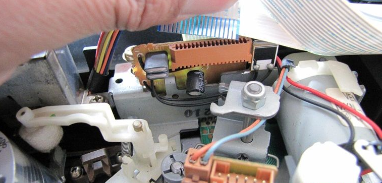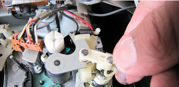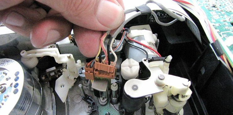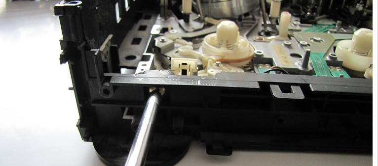 松下G型机芯的带仓传感器和机芯的状态开关是在CPU的预设程序下协调配合完成系统控制,卸下前面板,再卸下VR电路板,卸掉两个固定机芯的金属螺纹螺丝和机芯后中的一个自攻丝螺丝,掰松带仓传感电路板(6针)锁扣,分别松开其6线(4线往主板、2线带仓带尾光敏管的连线)。卸下带仓上盖板两个螺丝,并卸下带仓上盖板,取下带仓。