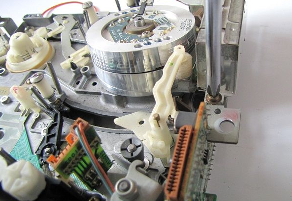 把机芯从底盘内整体提出,拔掉磁头放大电路板的14针(线)插件和磁鼓电路板10针(8线)插件,再拔掉FG放大电路板(18针至主板)FPC和机械电路板(15针至主板)FPC后,机芯总成即可完全与底盘脱离,单独进行机芯维修很是方便。