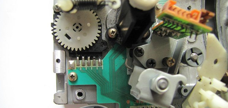 卸下倒带电机同步皮带和固定其的三个螺丝,拔掉音控磁头上方插件使倒带电机总成与机芯本体脱开,再卸下压带轮组件,即可完全暴露方式选择开关,卸下其固定两个螺丝,再焊开状态开关的5个焊点,即可取下方式选择开关,捏住四个白色卡子即可卸开方式选择开关,可见其内部铜黑氧化也比较严重。以拆卸反方向把机器装回。