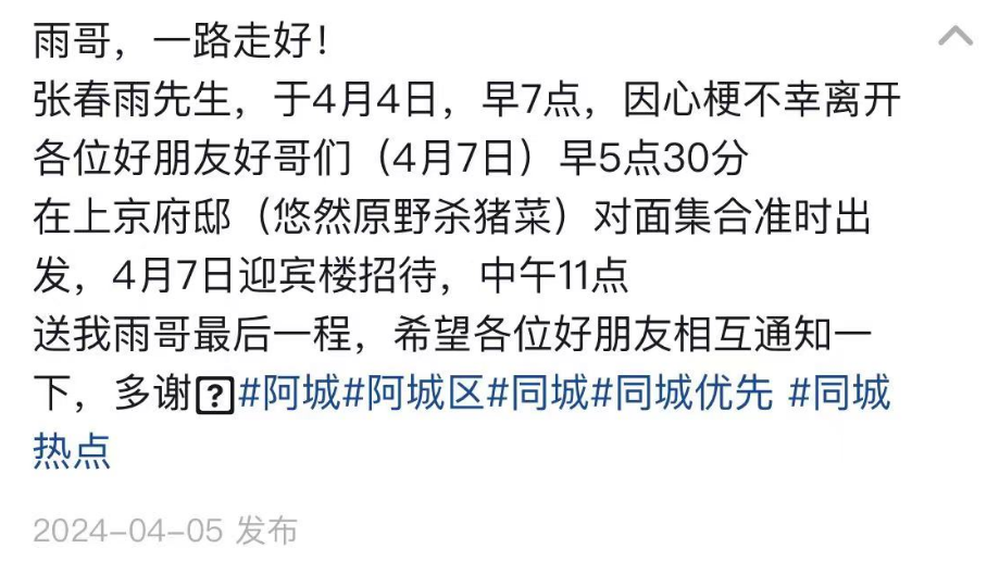 近日,网红圈又一起悲痛事件发生,来自黑龙江的网红“雨哥”因突发心梗去世,年仅35岁,其搭档对外发布讣告,告知雨哥(张春雨)于4月4日早7点因突发心梗不幸离世,其告别仪式于4月7日举办,希望各位好友相互通知一下,送我雨哥最后一程。