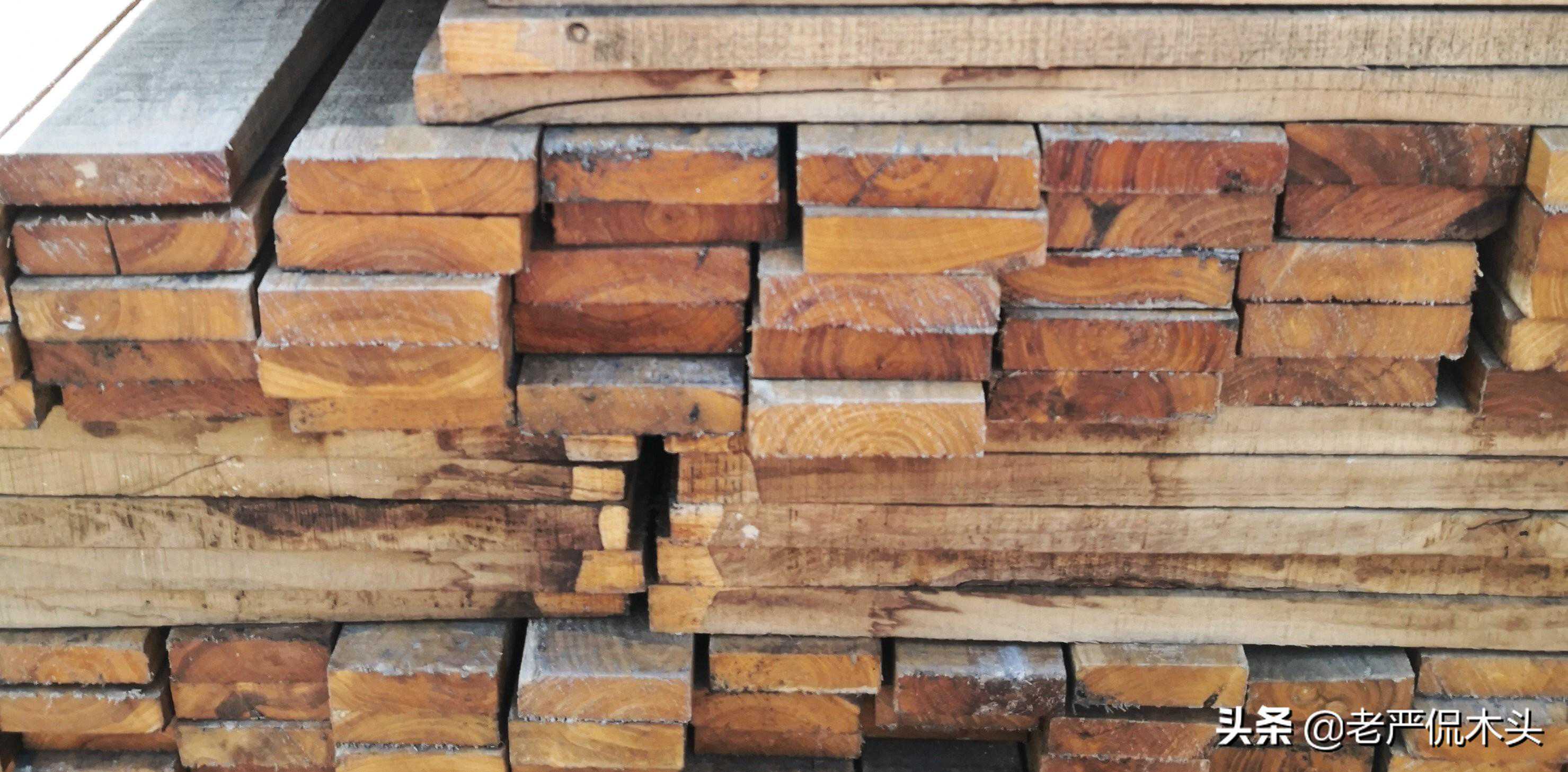 这一批槐木还未经窑干,被用等宽的木条隔开,再用铁线捆牢,基本杜绝了变形的可能,料主明显是个内行。我见猎心喜,提出要购买一捆。厂主很大方,直接白送。可惜的是未当场拉走,第二天厂家送楸木的时候落下了,心痛……