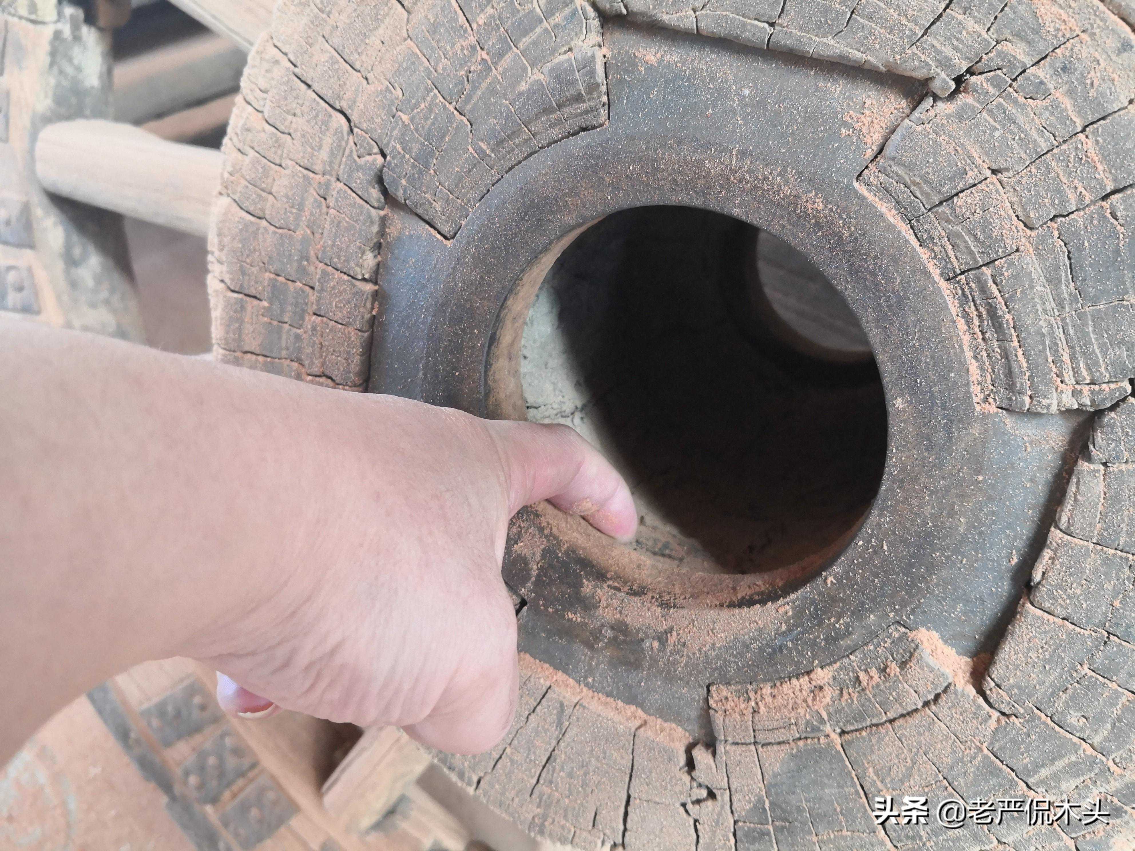 正巧这家木材的木匠师傅收藏有老马车的轮子,我手指扣住的这个圈圈就是杵榆制成的,虽经过经年累月的使用,仍然显得坚不可摧。