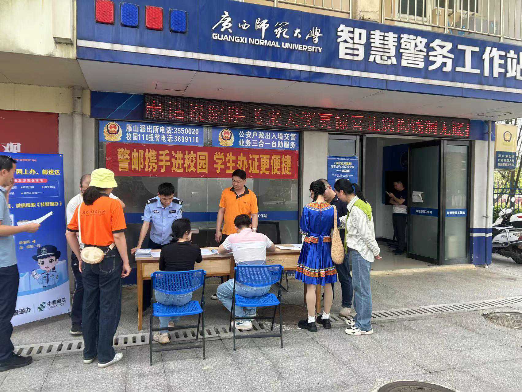 2024年4月2日,桂林市公安局人口管理部门携手中国邮政桂林分公司来到广西师范大学雁山校区,联合开展“警邮携手进校园,学生办证更便捷”便民服务活动,让同学们足不出校,一次性办完全部手续,让学生把时间和精力用在学习上,竭力打通为民便民服务“最后一公里”。