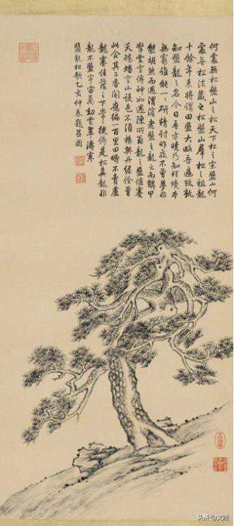 《盘龙松》图中的景象位于今天天津的蓟县盘山,乾隆在位的时候在这里修建了一座皇家行宫——静寄山庄。乾隆皇帝一生有不下三十多次光临这里,不仅在盘山留下了不少诗篇,还创作了这幅《盘龙松》。改图长约86cm,宽度为40cm。图中一棵松树立在山坡上,松树貌若盘龙,树干如龙的身体,树冠则像龙头,给人一种苍劲之感。