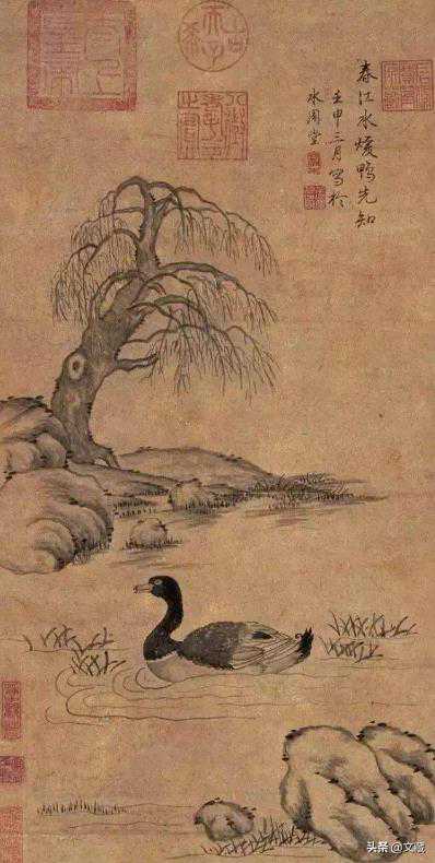 乾隆皇帝最开始学画的时候,虽然还没有当皇帝,但已经19岁了。对于绘画来讲,19岁开始学虽然不算晚,但也很考验一个人的耐心,尤其是零基础。根据乾隆的回忆,刚开始学画的时候,哪怕只是简单的小画,也要耗去他将近一个月的时间,对于一个自信心很强的人来讲无疑是很大的打击。后来乾隆找到了自己的方法,不再局限于古人,走自己的路,终于画出了这幅《柳塘凫浴图》。