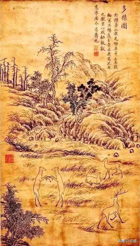 此画中的两只鹿后脚直立,前足相拥给人一种滑稽之感,然而这幅画所表达的内涵却值得人们尊敬。这幅画名为《多禄图》,画中有卧鹿,有奔鹿……鹿和禄谐音,画中一共有五只鹿,五在传统文化中代表吉祥,而这幅画正是乾隆送给他母亲的作品,希望母亲能够多福多禄。乾隆本身是一个很孝顺的人,通过这幅画也能看出一个皇帝的孝心。