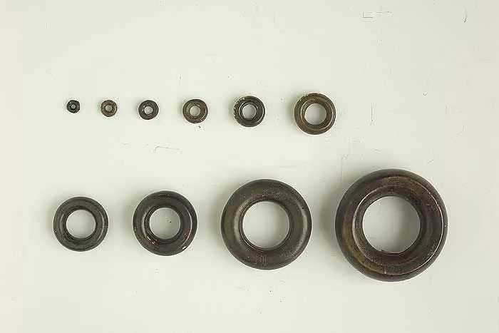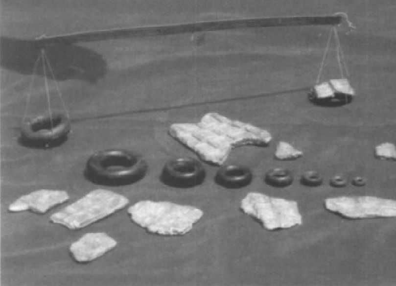 一套称重设备基本由一根天平杆、两个铜盘以及若干个大小不等的铜环权组成。在郢爯的流通过程中,应当是将所需的黄金数量由金钣上凿下来,经过天平权衡,方知其重量。作为贵金属称量货币,郢爯的实际价值还与其成色相关。郢爯的含金量差别很大,即便同时间、同地点出土的同一印文的郢爯,含金量也不完全相同。总体而言,郢爯的含金量高的达99%,低的仅70%,对于大量流通的贵金属货币,已实属不易。