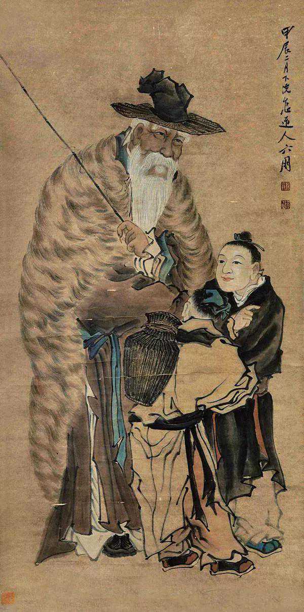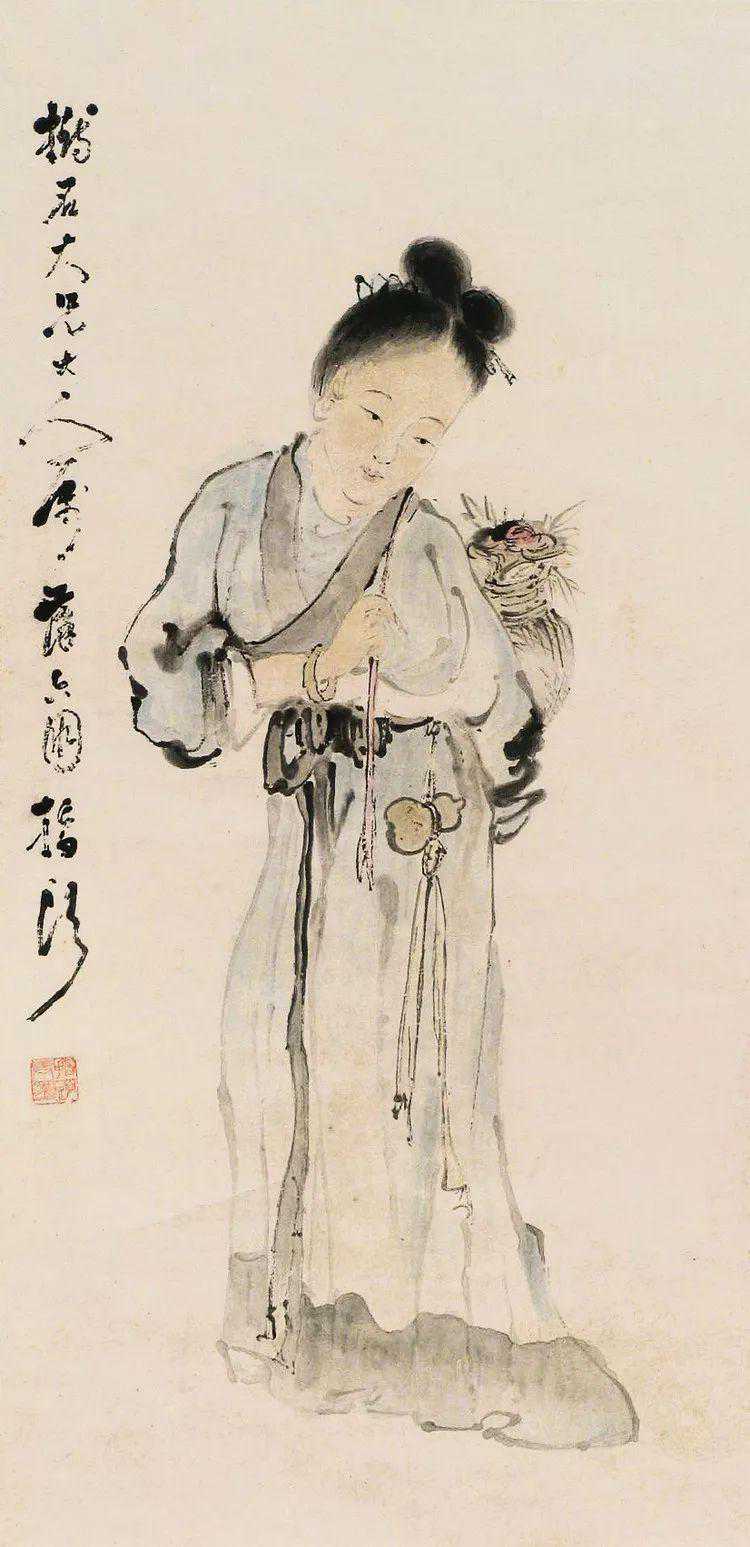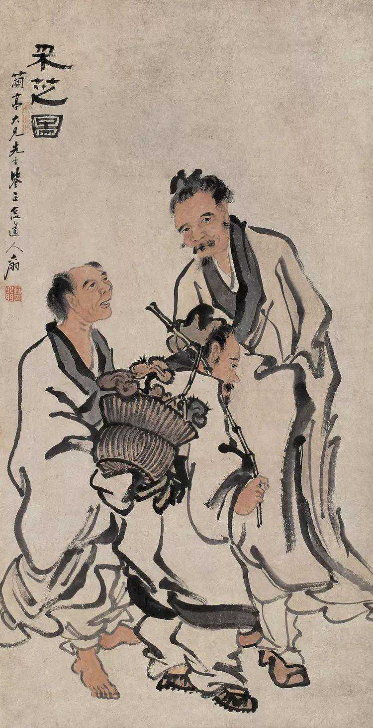 他还善于画“指画”,作大幅人物画时常以“指笔兼用”。一指一笔相互配合,能“工”能“意”,线条转合流畅,颇具得心应手之妙。