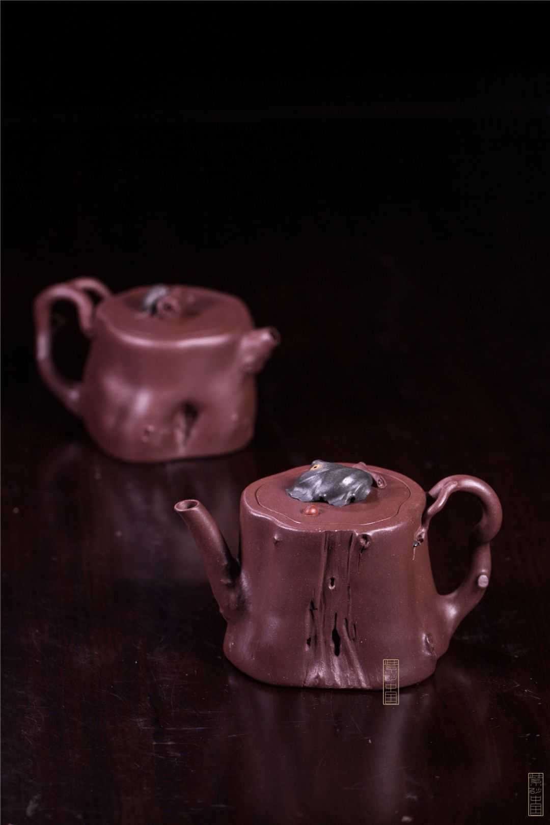 作品造型以模拟自然界的一段树桩为主体,其上树皮古朴,树洞断痕清晰可辨,平盖内嵌于壶口,交界线好似一圈生动的年轮,壶流,壶把仿佛是生长而出的树枝交错蔓延,尽显生命气息。