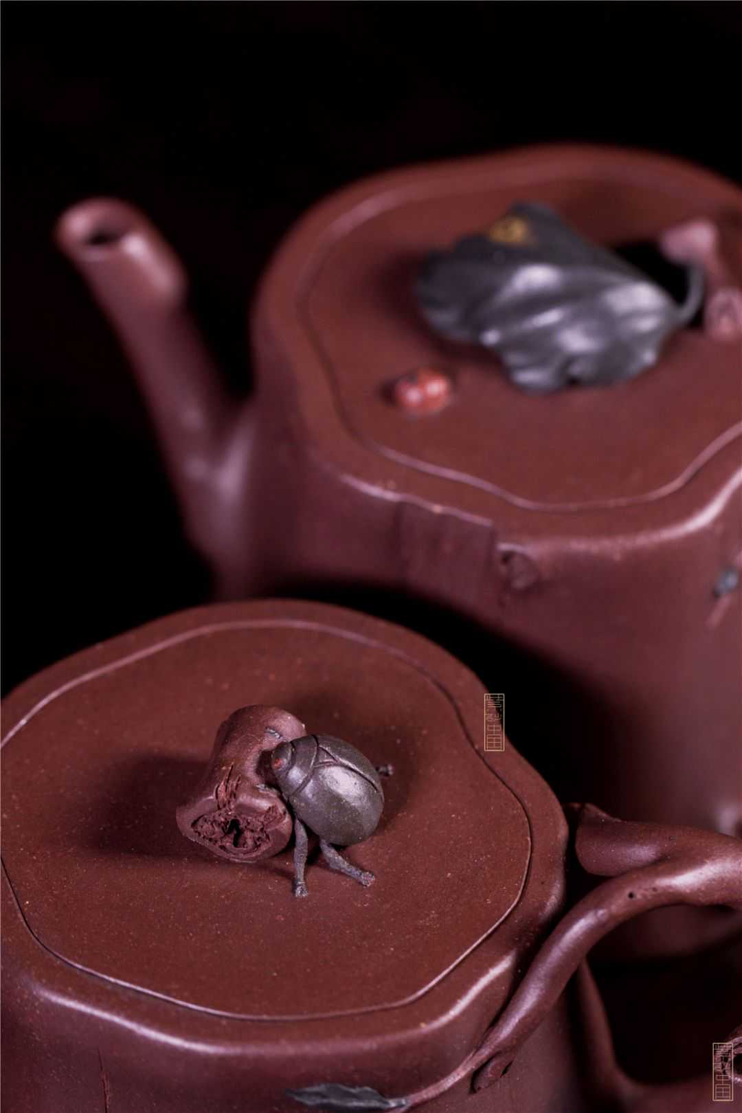 其壶纽塑了一片绿叶与小虫,形象逼真,甚是可爱,提升了自然意境之美,其紫砂泥料的天然色泽无形中增强了艺术效果,可谓自然趣味添神韵,花器造型显生机。