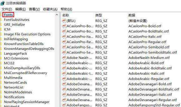 4、按以下顺序依次点开文件夹(【HKEY_LOCAL_MACHINE\\SOFTWARE\\Microsoft\\WindowsNT\\CurrentVersion\\Fonts】),找到字体Fonts。