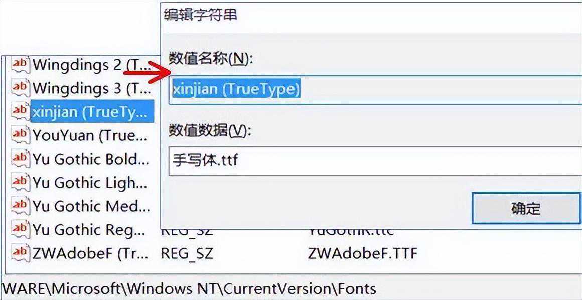 5、在右侧的字体列表中找到之前下载的新字体(此处为xinjian),双击打开,复制该字体的数值名称。