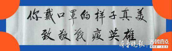 由齐鲁晚报·齐鲁壹点联合阿里巴巴天天正能量发起“你戴口罩的样子真美”公益活动正在进行中,前期照片征集工作已经结束。在征集到的照片主人公中,既有一线医护人员、公安民警、社区工作人员,也有不图回报的志愿者和普通市民,他们都是真正的战疫英雄。11日,书法家贾绪荣老人特地创作了多幅书法作品,用这样的方式致敬战疫英雄。