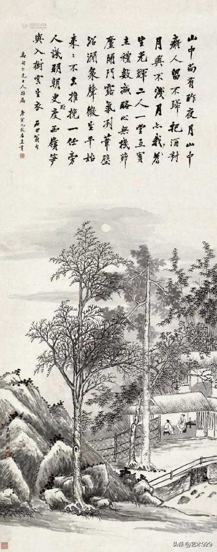 题跋:山中尚有昨夜月,山中痴人留不归。把酒对月兴不浅,月亦我为生光辉。二人一堂互宾主,礼数减略心无机。茆庐开门露气冽,苇壁浴涧泉声微。生平始来来不去,推挽一任旁人识。明朝更酌度西岭,笋与入树云生衣。石田翁句。禹甸仁兄大人指属。庚寅(1890)九秋,石查赏。钤印:石查书画(白文)