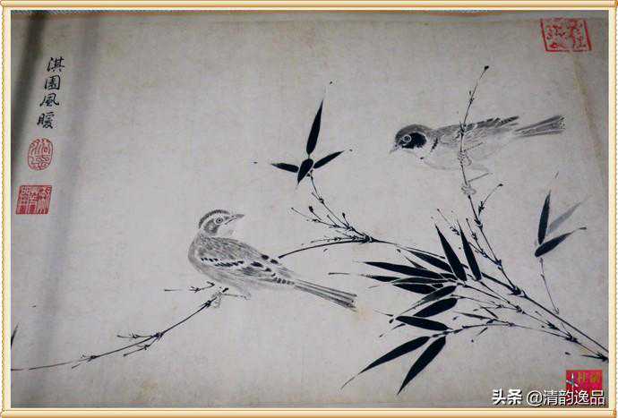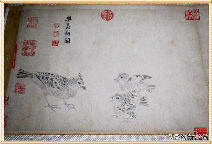 又如描绘禽鸟的情态,《写生珍禽图》亦有精彩之处,如第十一段“原上和鸣”的回首顾盼,第五段“碧玉双栖”的动静对比,以及第二段“熏风鸟语”的凝神引颈。流传近千年的徽宗《写生珍禽图》,传承有绪,斑斑可考。上有清代乾隆皇帝题写的图名和御用玺,计21方,收藏印7方;此外,还有明代著名收藏家安仪周,清代著名收藏家梁清标的收藏印19方。当代最具权威的中国古代书画鉴定家张珩、谢稚柳、徐邦达等均有论著考证。