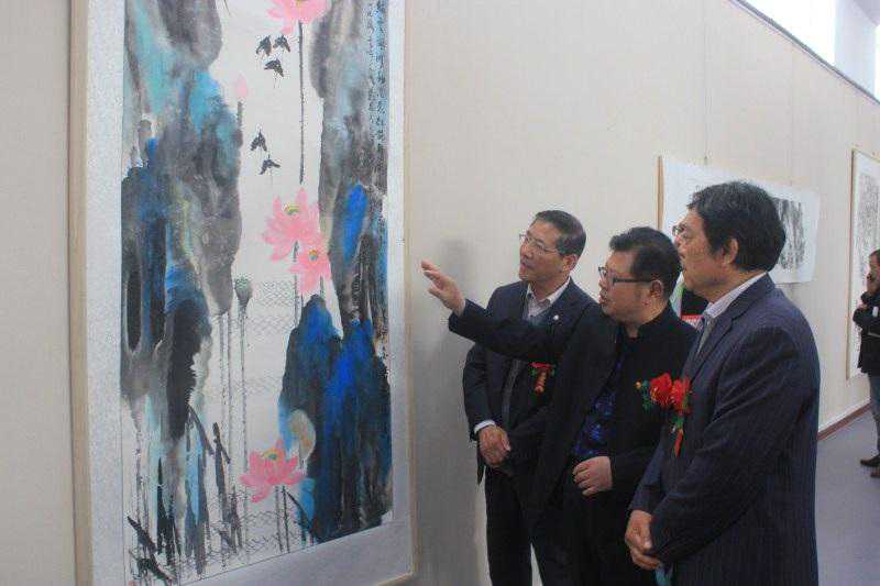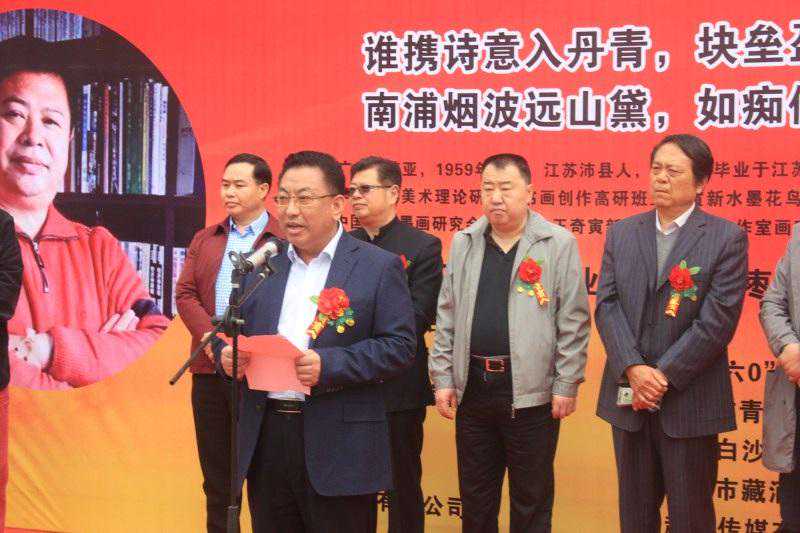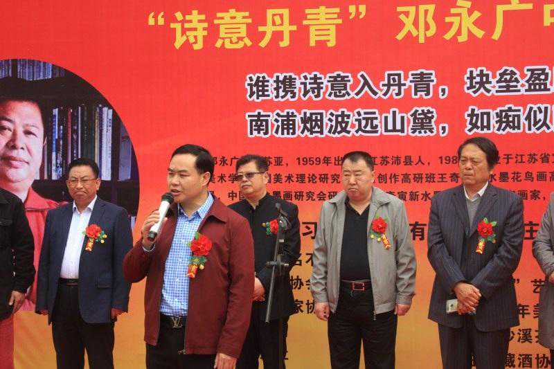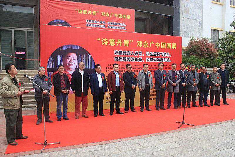 开幕式由枣庄市美术家协会副主席巩崇君主持,江苏省国画名家邓永广致谢词,习将军酒业有限公司总裁刘飞,沛县宣传部原副部长、文联主席朱茂龙分别致辞。民建枣庄市委副主委、市人大民侨外委员会副主任翟庆龙,沛县原宣传部副部长、文联主席朱茂龙,沛县书画院副院长张劲,市诗词联赋家协会主席张明军,市美术家协会副主席仇顺廷,市美术家协会副主席、薛城区美术家协会主席张延华,台儿庄区书法家协会主席刘光,中国国画院鲁南分院常务副院长、市书画学会副会长何剑华,市国学教育促进会副会长郭思然,市青年美术家协会、市青年书法家协会副主席刘毅,市大运河书画研究院院长张继国,中国茶叶流通协会茶馆专业委员会副主任、市茶文化协会常务副会长兼秘书长魏江,以及来自徐州、枣庄两地的书画艺术家、爱好者一百余人参加了开幕式。