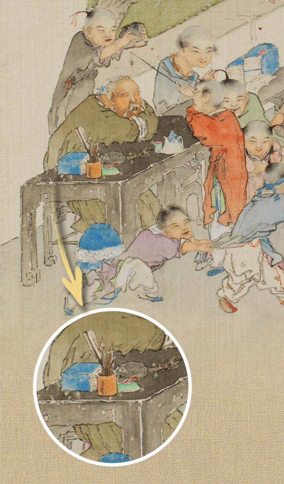 △清钱慧安百子图册之闹学戳图看夫子常用哪些文具?