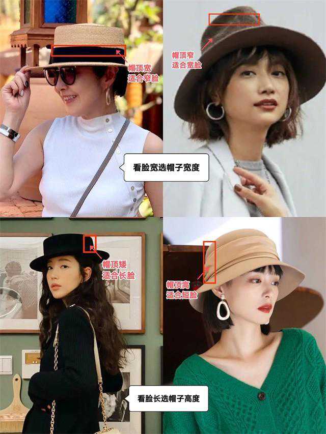 最后,针对不同脸型的女性,选择恰当的帽型至关重要。比如,拥有狭窄脸型的女性可以选择帽顶宽松的款式,如圆顶礼帽或是软顶新闻帽;而宽脸型的女性,则更适合帽顶紧致稍微有点尖的款式,如山顶帽或是西部牛仔帽。