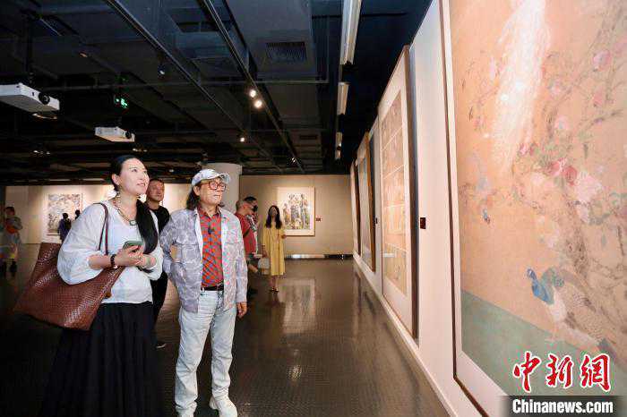 中国国家画院研究员石齐、天津画院专职画家任欢在展览现场观看作品。刘俊苍摄