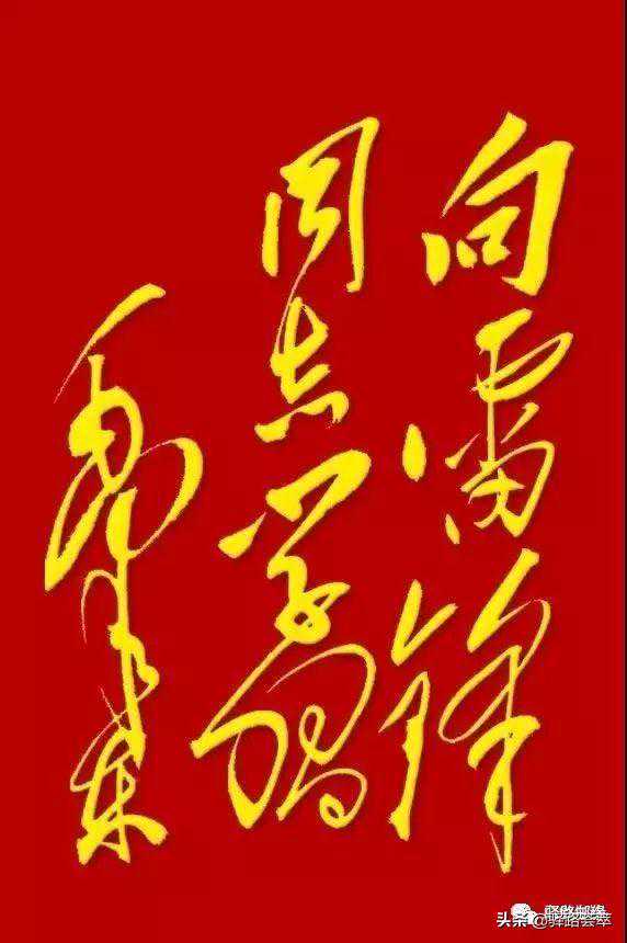 图案为毛泽东“向雷锋同志学习”的题词手迹,题词红底金字,镶金色边框,醒目庄重。