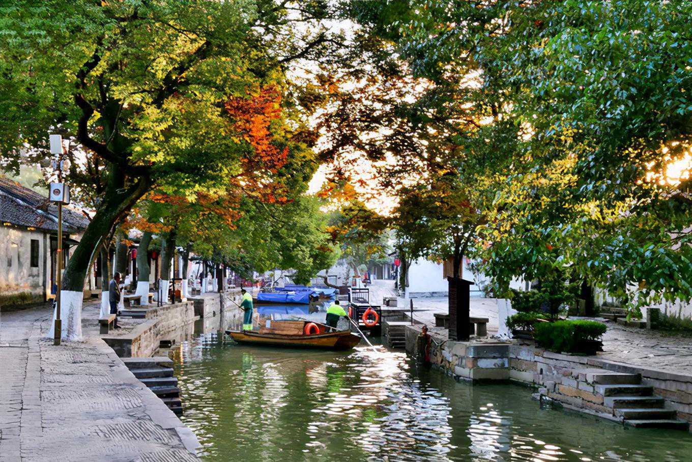 沿河青石驳岸,岸边和欢、女贞临波倒映,两岸筑有花石栏。河中船来船去、桥上人来人往,是同里古镇一道独特的风景。